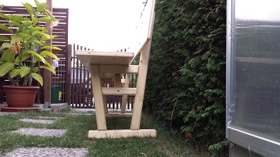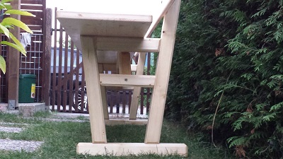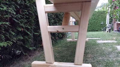 Diese Gartenbank wird komplett aus Holz gefertigt. Lediglich die zusätzlichen Schrauben sind aus Metall.