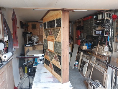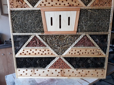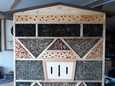 Das Hotel ist bestückt mit Stroh, Heu, Zapfen, verschiedenen Sorten Baumrinde, Schmetterlingsspalten und vielen Höhlen und verschiedenen Bohrungen für Wildbienen, etc..