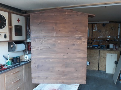 Ringsherum wie die Rückwand und die Seitenwände und mit Wetterschutzfarbe gestrichen.