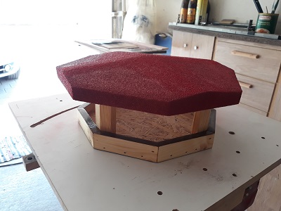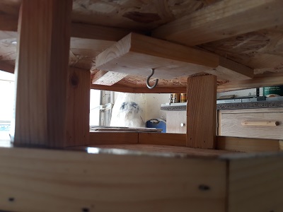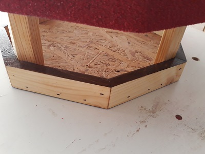 ist geklebt, getackert, und hat in der Dachmitte unten ein Haken zum Aufhängen von Speck oder Meisenknödel etc.