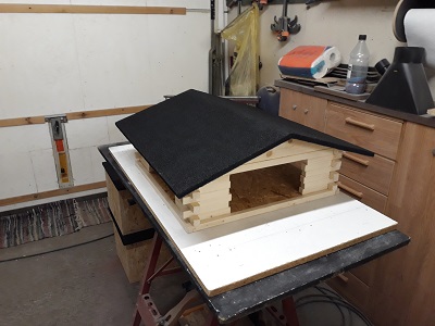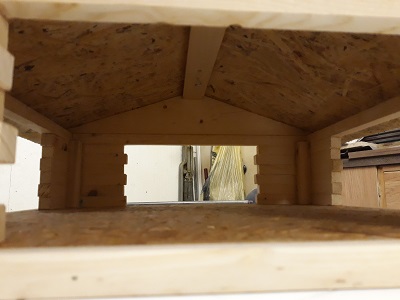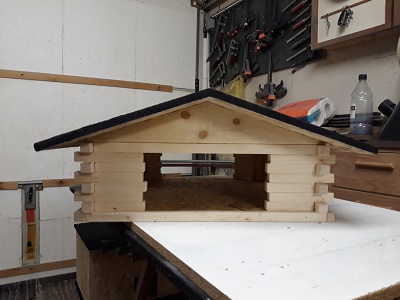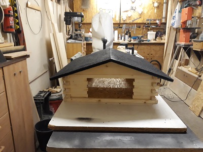Zwecks großer Nachfrage nach einem etwas größerem Vogelfutterhaus ... hier die große Variante 45cm x 45cm (Bodenplatte) im Blockhausstil gefertigt.